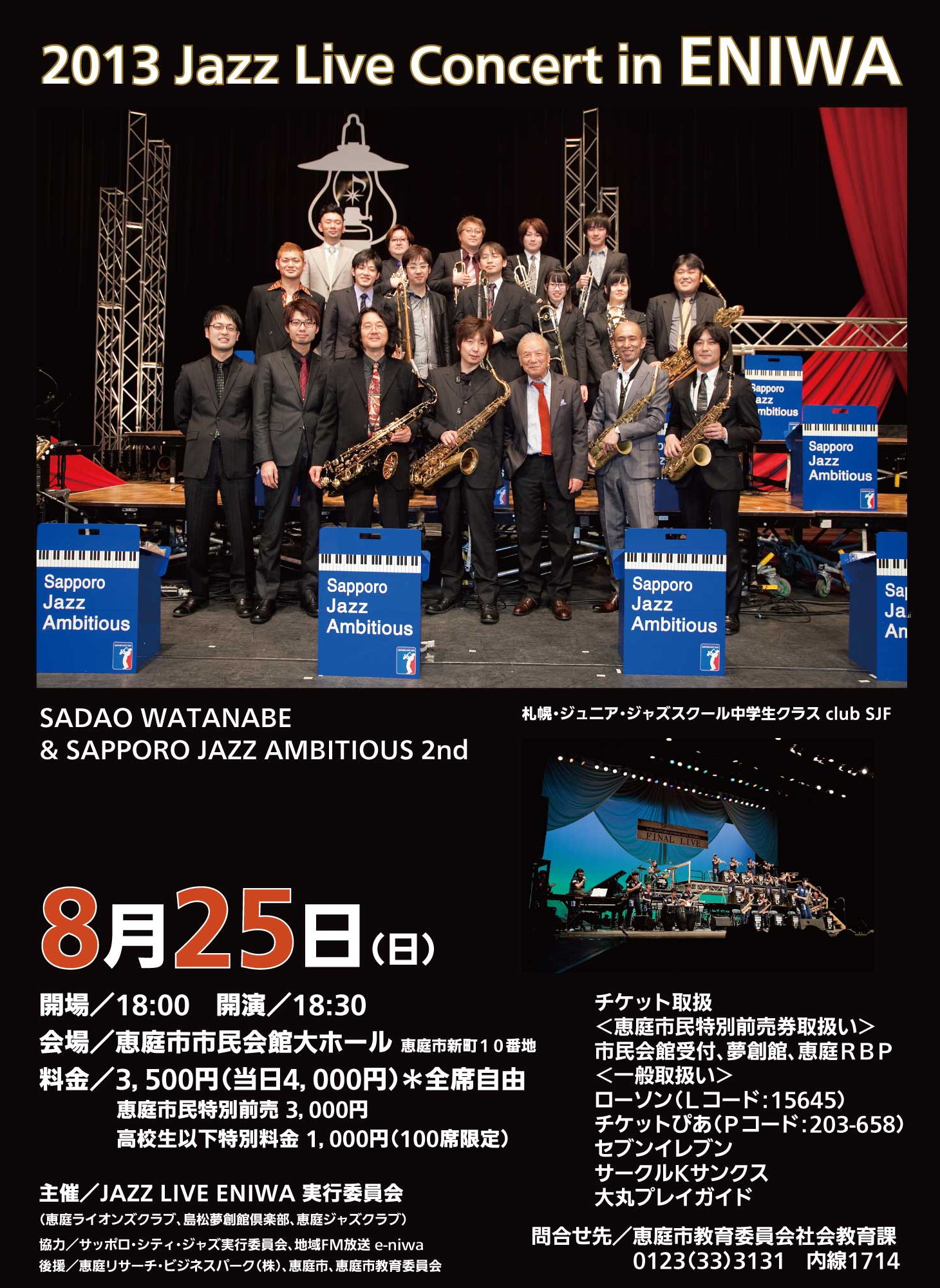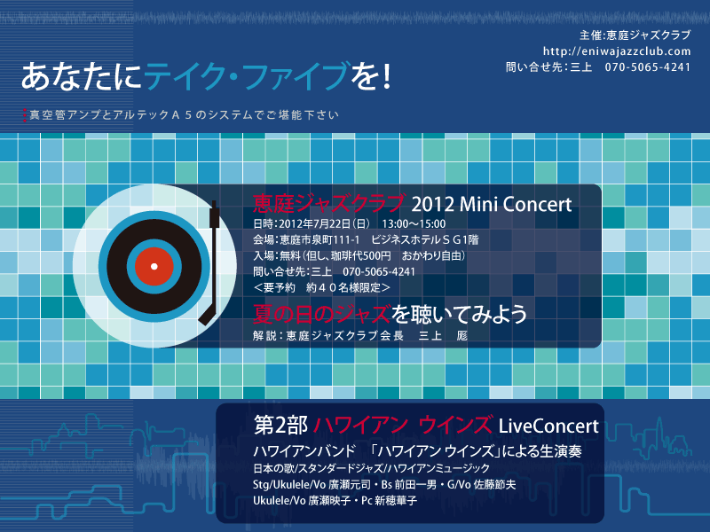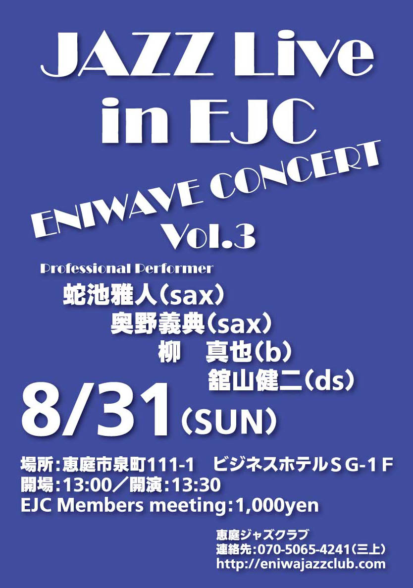 恵庭ジャズクラブのホームページへようこそ。 恵庭ジャズクラブに関する情報をお知らせしています。 恵庭に音楽の波を起こしましょう。小さな波は大きく育つ、そんなクラブにご期待下さい。